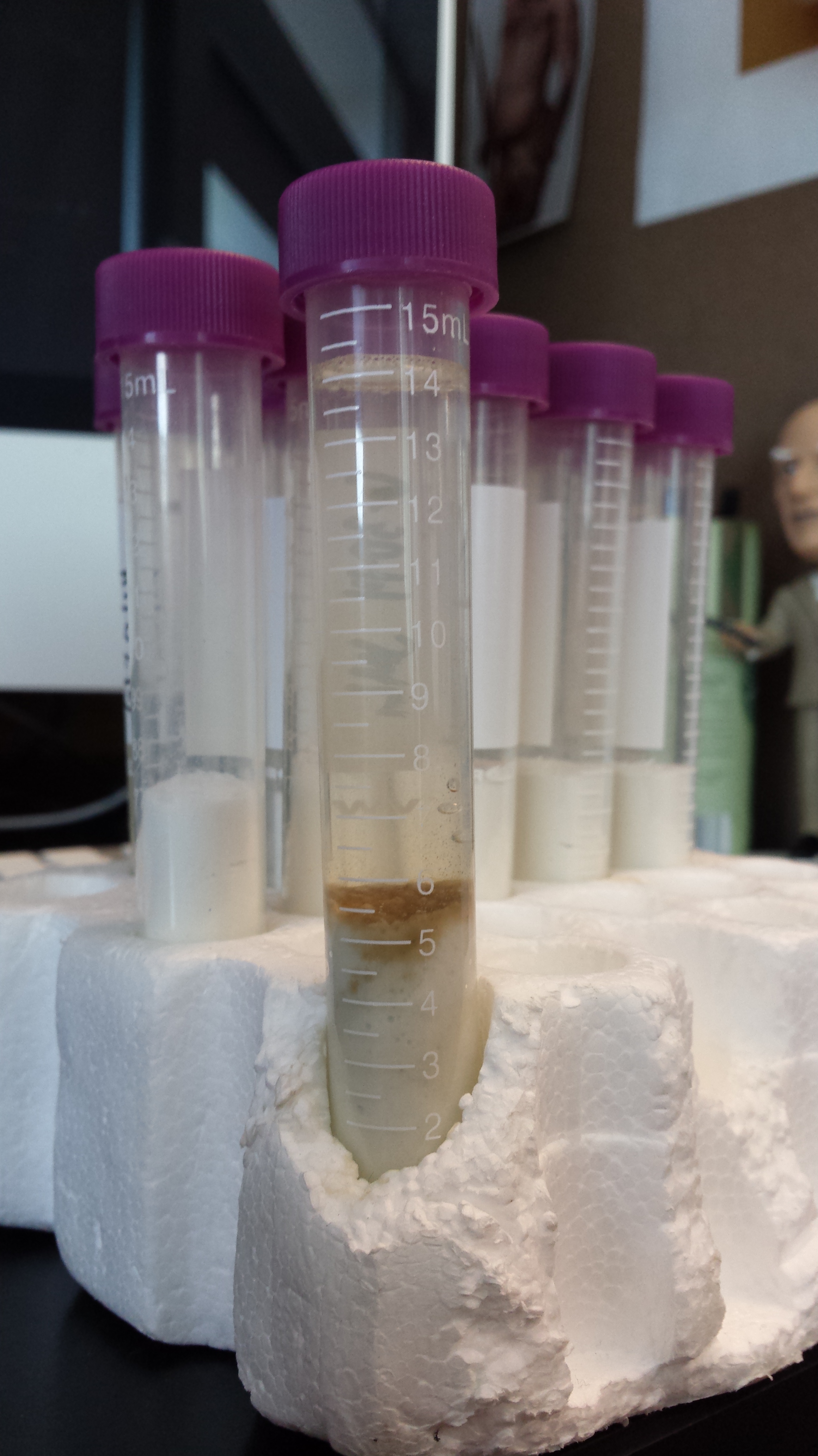 In some tubes we are starting to see defined layers. Layers seem to vary between tubes containing seawater from different sample locations as well as between tubes with water from the same location.