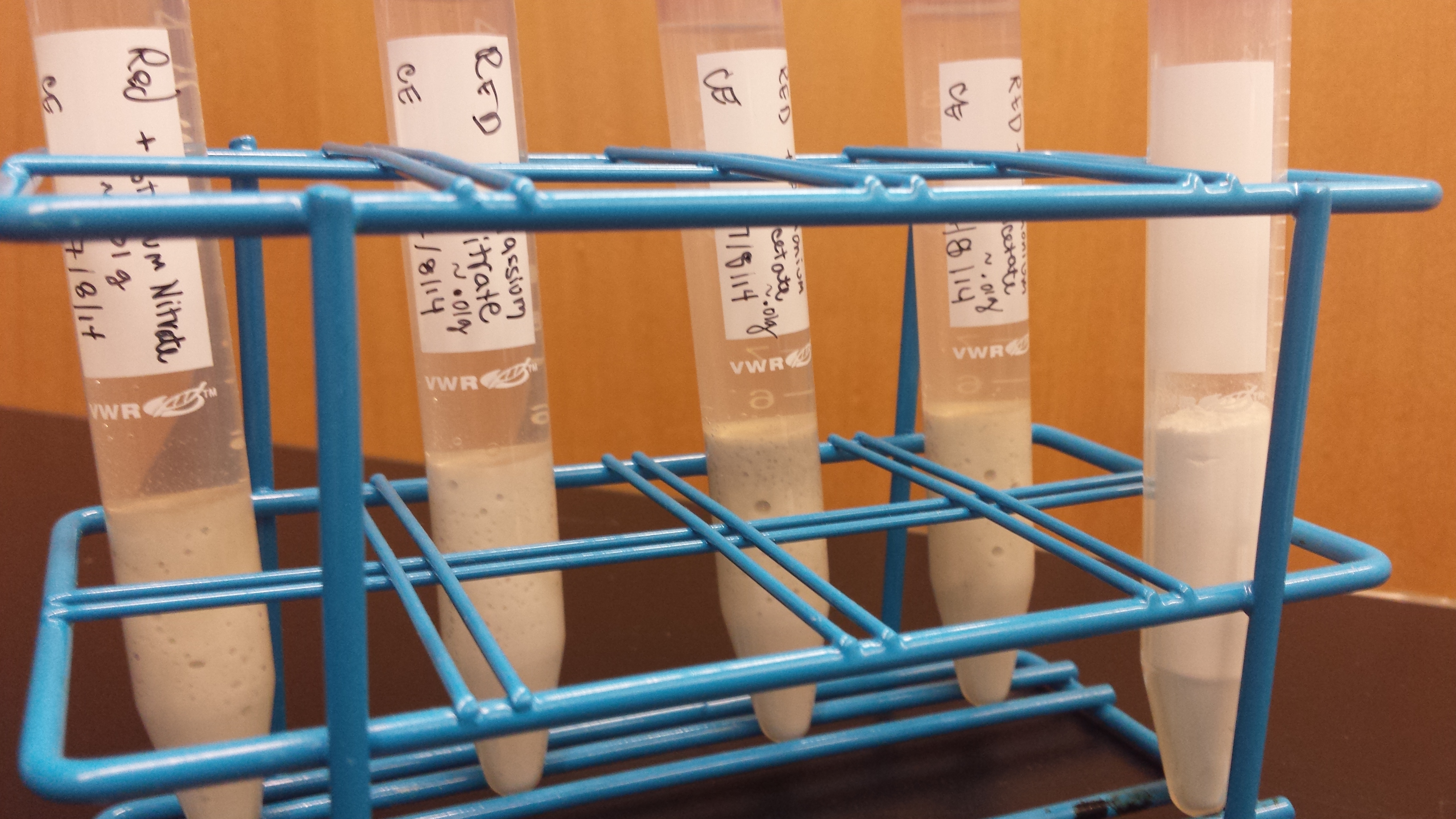 Experimental tubes at 3 weeks (where we added either Potassium Nitrate or Ammonium Acetate):
