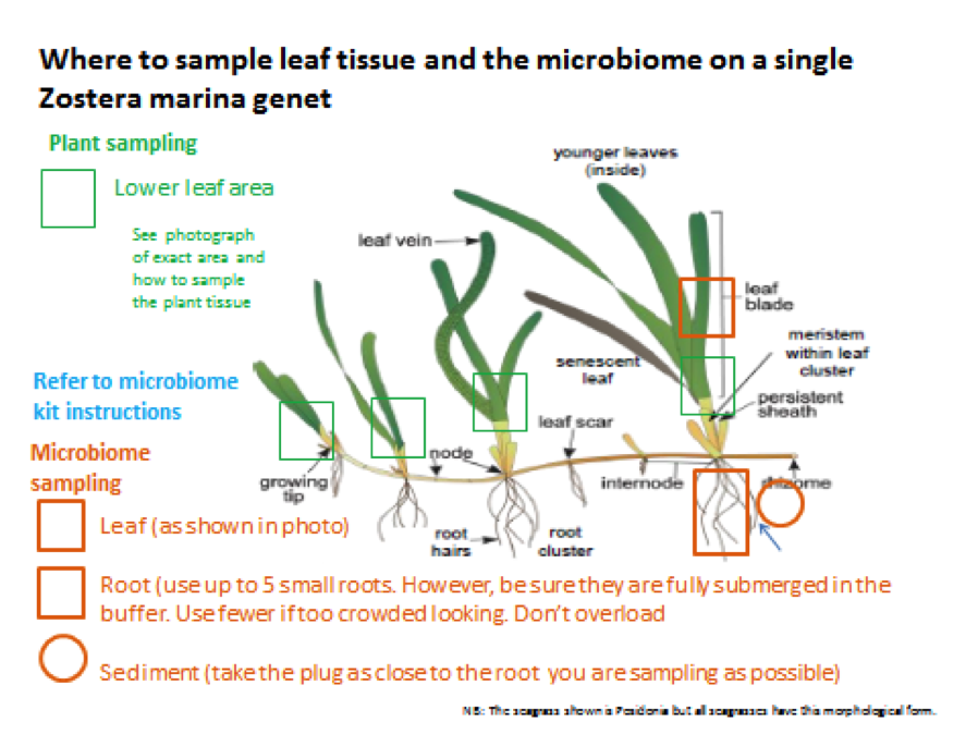 The sampling kits sent by the seagrass microbiome group have focused on the microbial aspect of this project. We have asked members of the Zostera Experimental Network (ZEN) as well as additional collaborators to sample both plant tissue for sequencing (coordinated through Jay Stachowicz and Jeanine Olsen) and microbiome samples. We are extremely excited about this sample set, as it covers populations of Zostera marina across many different environments, for which we already have extensive metadata through the ZEN group! We are requesting root, sediment (within the rhizosphere), and leaf tissue, as detailed in the diagram below (courtesy of Jeanine Olsen).